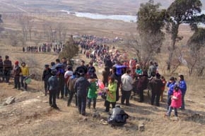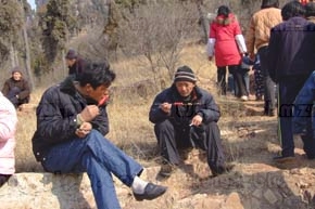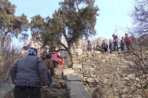 刚出崮尚,就看到十里八乡三五成群赶会的人们,从各个方向涌向昌平山,并传来阵阵的鞭炮声。很早以前就有九顶七泉昌平山之说,是个山水相依之处,这里基本上是个荒山,一些柏树大部分都是1958年栽的,50年没有绿化了。山凹处有一座玉皇庙,始建于明朝中后期,是一座岩泉飞瀑石洞玲珑的胜境地。每年烧香的人们络绎不绝。阵阵的鞭炮声打破了昌平山的幽静。